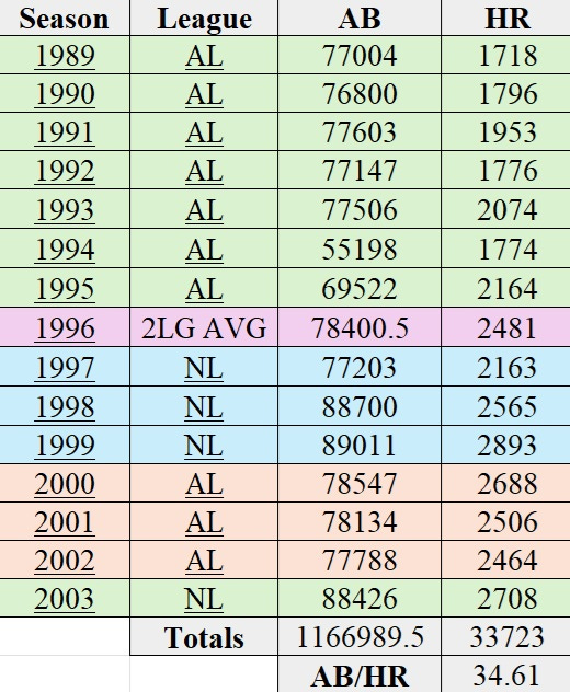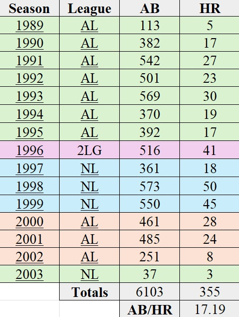 Now that we have a deeper appreciation for Greg Vaughn as a hitter, we can move forward with our unique career AB/HR analysis. According to Baseball Reference, Vaughn’s official statistics reveal a total of 355 home runs over 6,103 at-bats resulting in an average of at-bats per home run 17.19 (AB/HR).